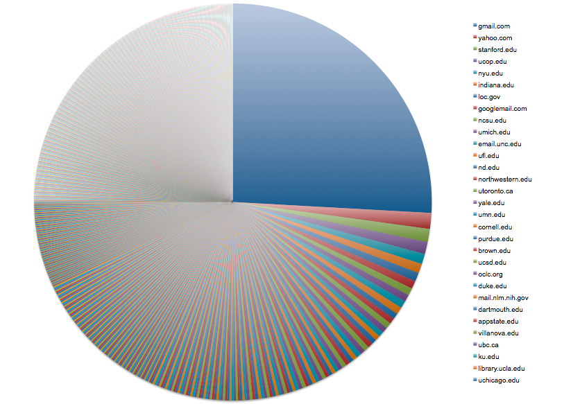 It is interesting to note how many of the subscribers seem to be located in Mountain View (California). This is because many people use Gmail for their mailing list subscriptions. The mailing lists I moderate/manage are heavily based in the United States, western Europe, and Australia — for the most part, English-speaking countries. There is a large contingent of Usability4Lib subscribers located in Rochester (New York). Gee, I wonder why. Even though the number of subscribers to Code4Lib and NGC4Lib is similar, the Code4Libbers use Gmail more. NGC4Lib seems to have the most international subscription base.