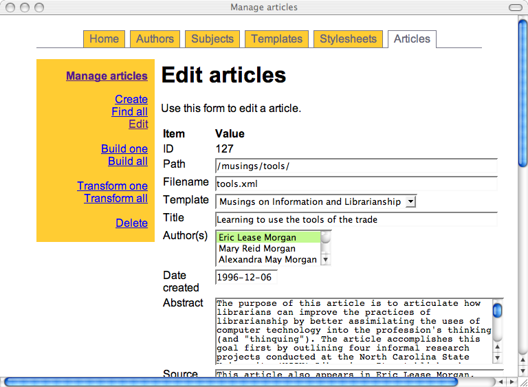 The articles.cgi script is the most complex. It allows me to enter things like title, date created, abstract, and changes information. It also allows me to select via pop-up menus subject terms, authors, templates, and stylesheets to associate with the article.