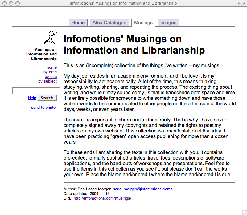 I make no bones about it. I'm not a great writer. On the other hand, over the years, I have written more stuff than the average person. Furthermore, I certainly don't mind sharing what I write whether it be prose, the handout of a presentation, or the code to a software program. I've been practicing "green" open access and open source software long before the phrases were coined. As a librarian, it is important for me to publish my things in standard formats complete with rich meta data. Additionally, I desire to create collections of documents that are easily readable, searchable, and browsable via the Web or print.