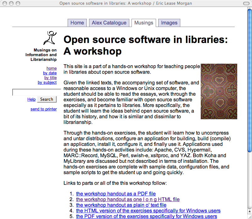 Sometimes I feel like Ben Franklin. He was a writer (a much better writer than myself). He owned his own printing press. (In fact he owned many of them across the colonies.) He also designed his own typeface. Not only that, he was Postmaster for a while. In short, he had control of the entire distribution process. With the advent of the Web, much of that same distribution process is available to people and institutions like myself. All that needs to be done is design systems that fit one's needs and implement them. Such things exemplify enormous opportunities for cultural heritage institution such as libraries, museums, and archives -- as well as individuals.