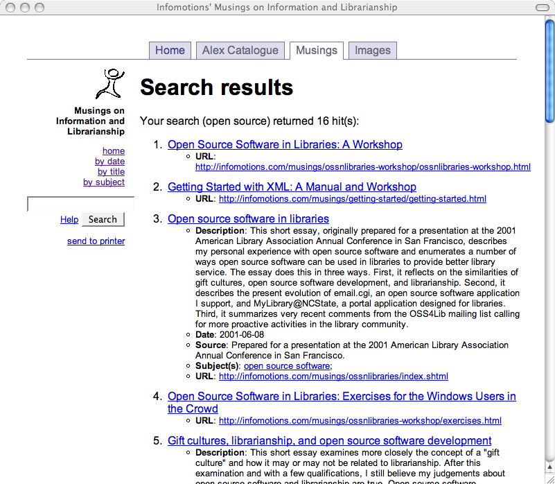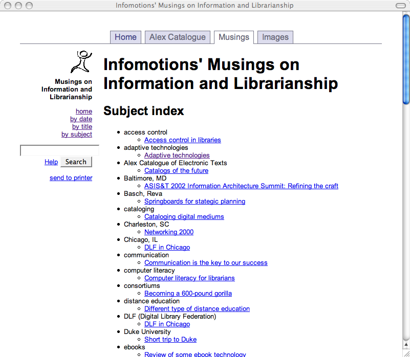 To make this happen I wrote one more CGI script, the system's home page . This page includes an introduction to the collection, a search box, and a list of three links to title, date, and subject indexes. These indexes are created dynamically taking advantage of Musings.pm. If I got fancy, I could count the number of times individual articles where read and provide a list of articles ranked by popularity. Similarly, I could watch for types of searches sent to the system and create lists of "hot topics" as well.